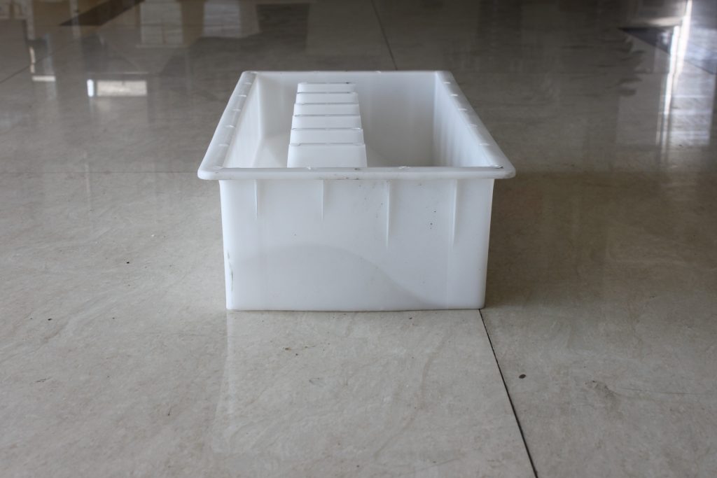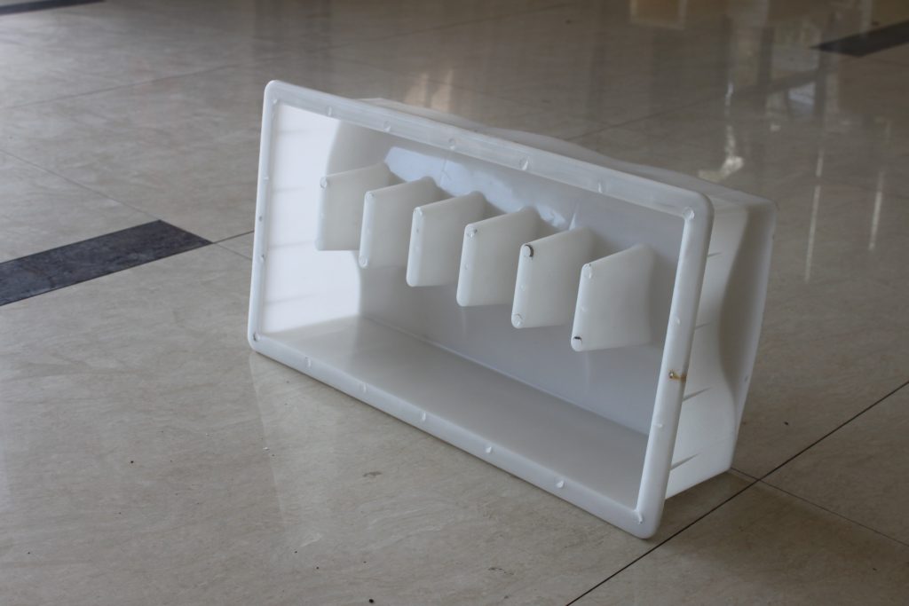 路牙石塑料模具整體外觀為長(zhǎng)方形結(jié)構(gòu),因其尺寸較大,在模具的周邊及底部分別做了加強(qiáng)筋設(shè)計(jì)以保證在實(shí)際水泥路牙石澆筑過(guò)程中的穩(wěn)定性。從模具內(nèi)部的結(jié)構(gòu)我們可以看出,塑料路牙石模具主要采用了S型坡面設(shè)計(jì),六個(gè)塑料堵頭,即所制水泥路牙石的六個(gè)排水孔,實(shí)際應(yīng)用較多的道路段為易積水或地理位置較低區(qū)域。