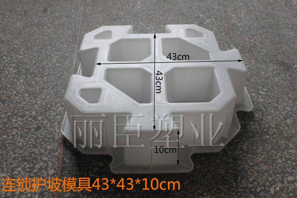 一款比較新穎的自鎖式護坡磚模具,廣泛運用于水利護坡設施項目,麗臣品牌護坡磚模具均采用聚丙烯塑料,質量更為穩定。由于其可靠的自鎖形式,是生態護坡穩定運行的一個重要基本要素,大量預留可植草間隙,更是提升了這個生態護坡模具所制自鎖式護坡磚的可操作性。