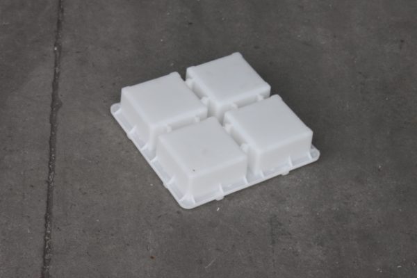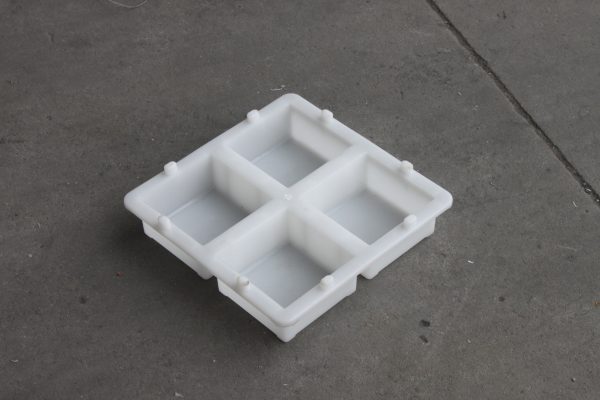 一脫四整體結構的水泥磚模具,全新聚丙烯塑料材質,采用臥式注塑機半固定式注塑模具,單型腔熱流注塑成型。水泥磚塑料模具整體尺寸為22*22CM正方形結構設計,共分為4個10*10*5的水泥磚脫模空間。